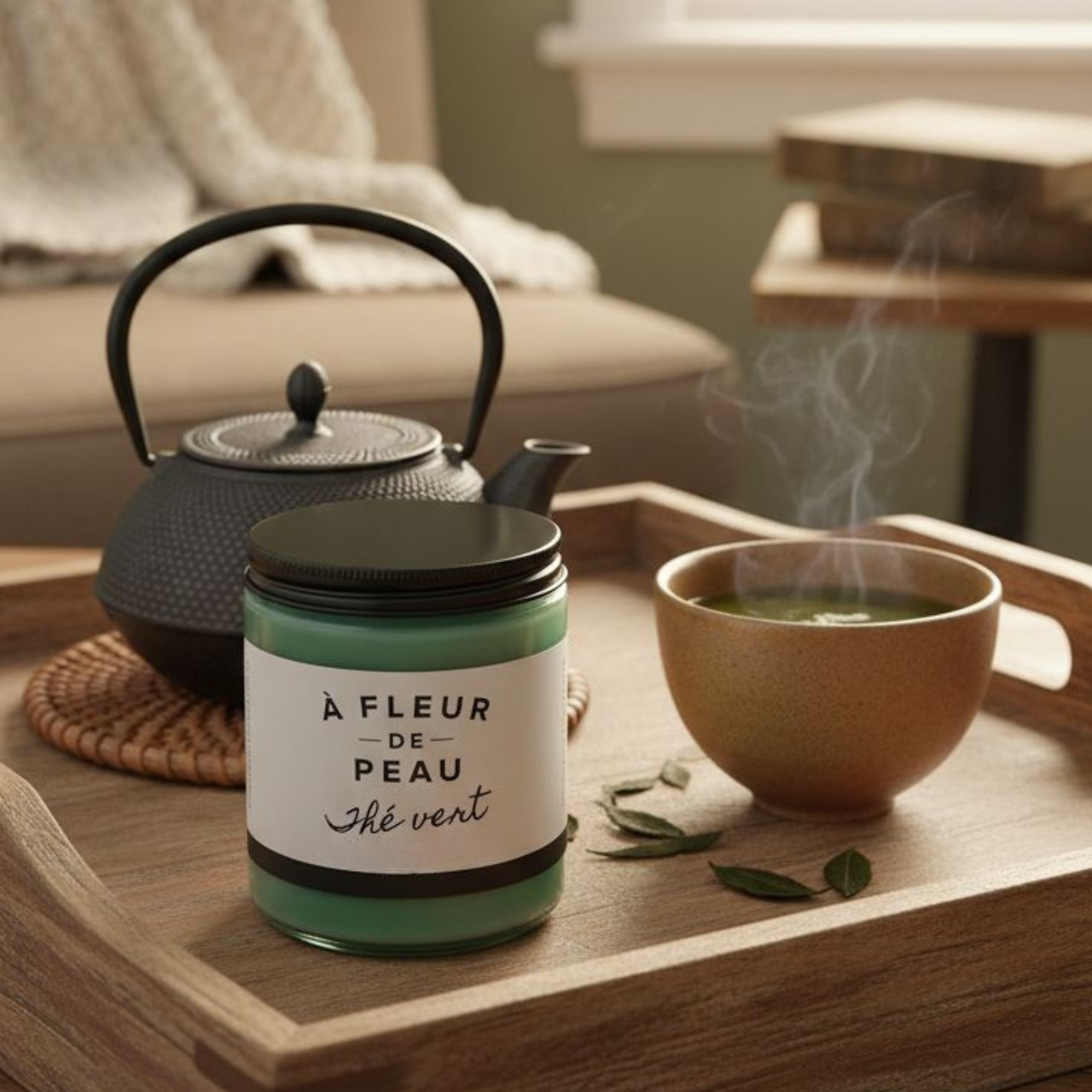 L’arôme pur et apaisant du thé vert infusé, pour une atmosphère zen et délicatement herbacée.